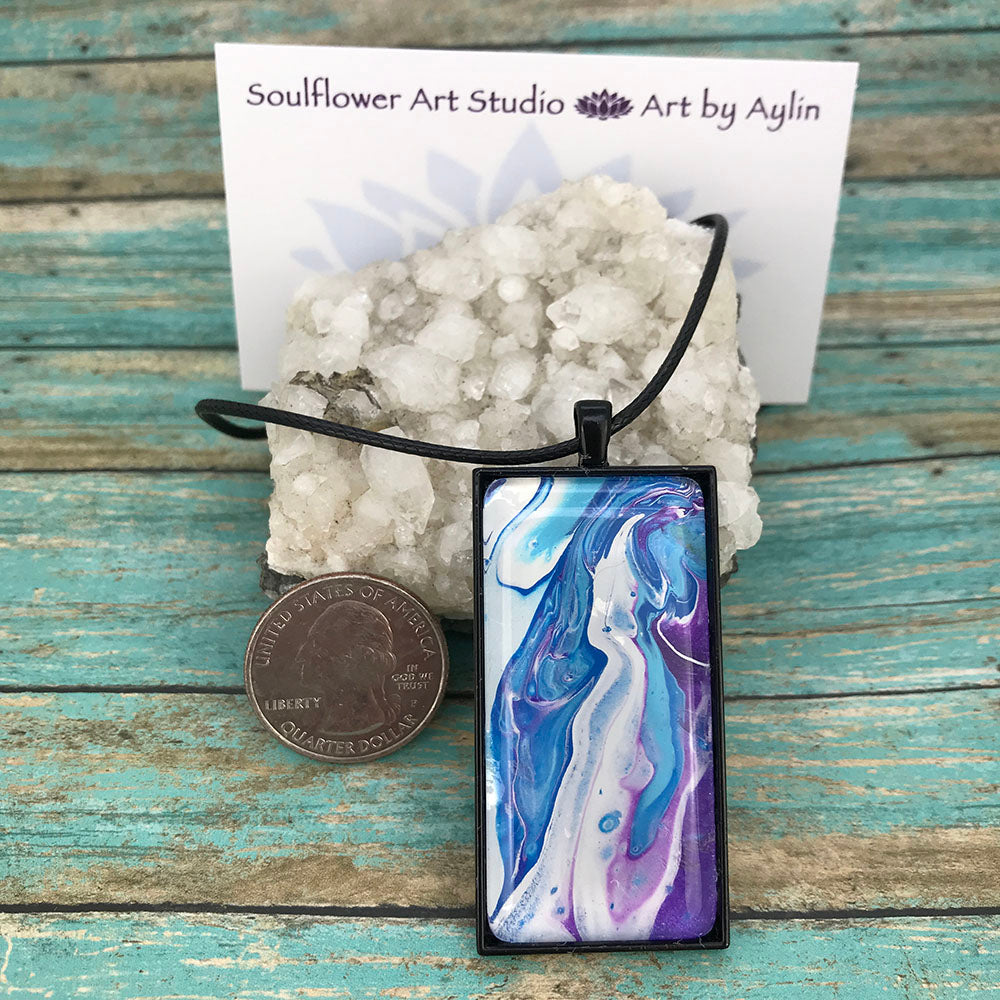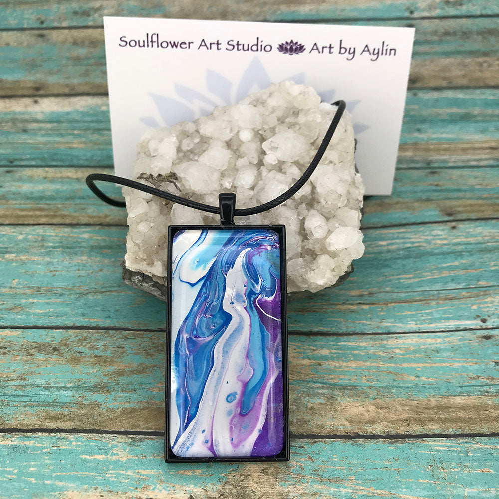 Blue Purple White Fluid Art Necklace - Wearable Art Collection by Aylin Uztin.
