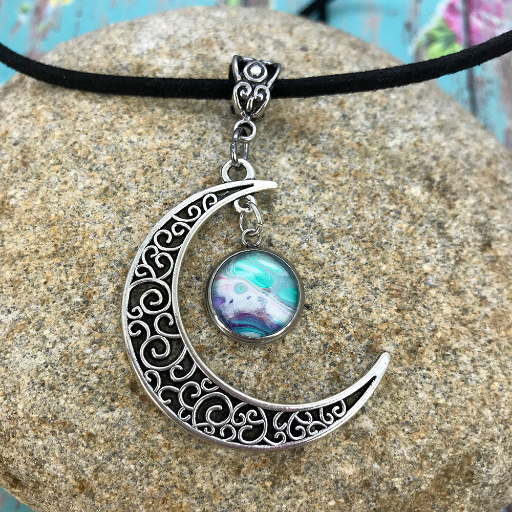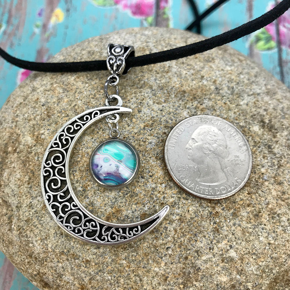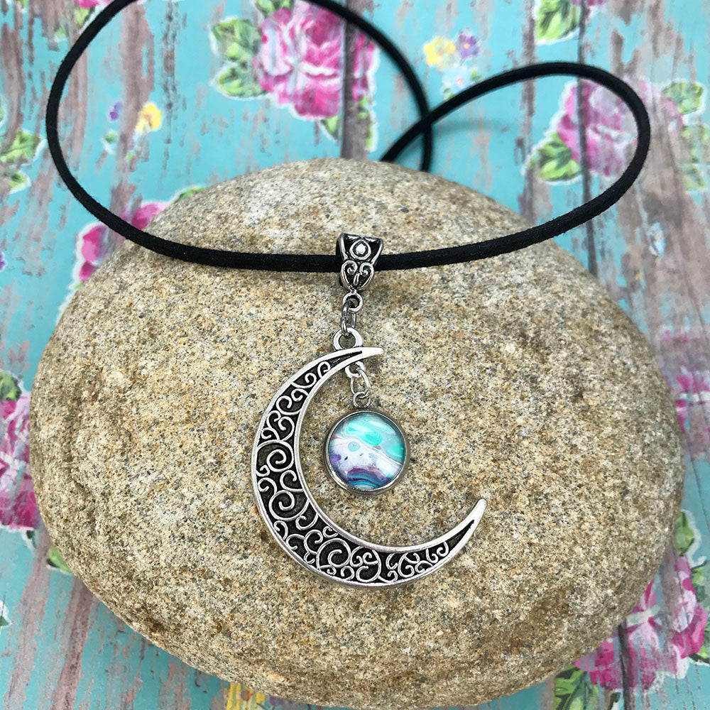 Crescent Moon Blue Purple Fluid Art Boho Necklace
